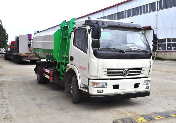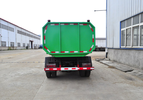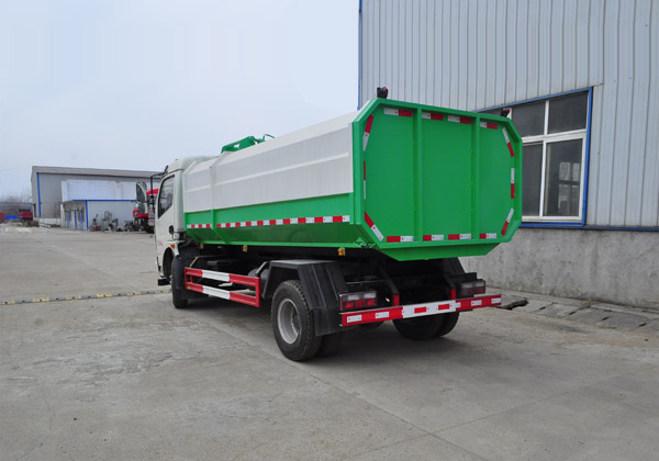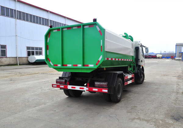 工作原理:自裝卸式垃圾車是由密封式垃圾廂、液壓系統、操作系統組成,能配幾十個垃圾桶,實現一車與多個垃圾桶聯合作業,廂體上的液壓升降裝置可將垃圾桶吊上、放下,上下升降,上下一次工作循環時間為50S,密封式廂體環保衛生,可避免二次污染。其自裝式的掛桶裝置可直接將路邊的垃圾桶掛在上面用提升機直接到在垃圾箱體里面省去了裝垃圾的麻煩。